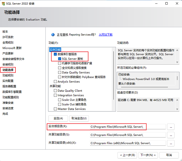 10、功能选择,建议选择这两个基本功能,更改实例根目录(这里注意更改实例根目录只建议更改盘符,后面路径不要更改),点击下一步;