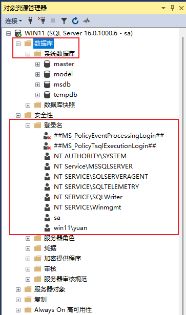 这里因为是新安装的数据库软件,上面并没有数据库以 NT 开头的登录名是系统自带的数据库账户