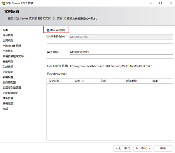 11、实例配置,这里一般选择默认实例,点击下一步;