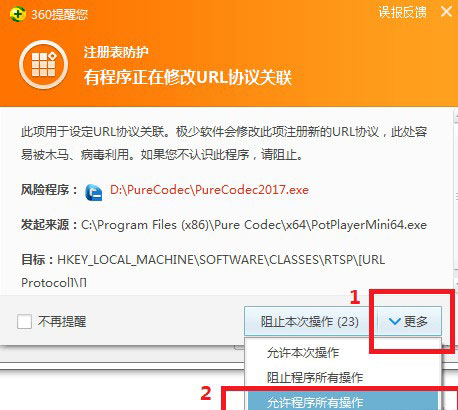 1、如果你选择了“关联多媒体文件”,防病毒软件可能会拦截,以360安全卫士为例,被拦截时要选 “更多”-〉“允许程序所有操作