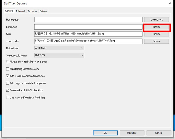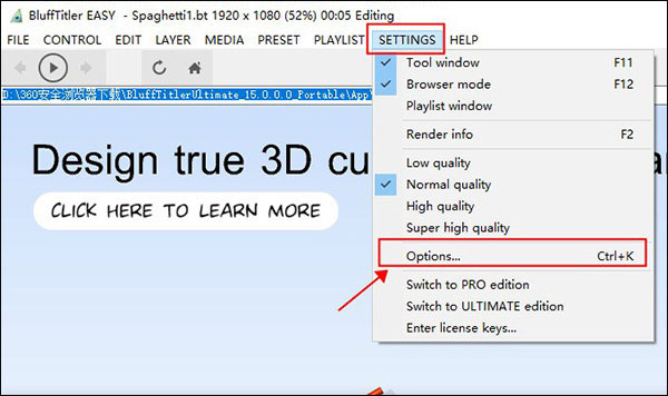 2、双击运行"BluffTitlerPortable.exe"程序直接打开软件,点击SETTINGS-Options,进入到选项界面;