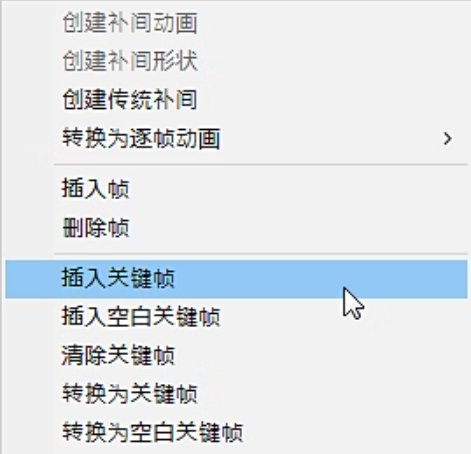 2)若要创建关键帧,请选择“插入”>“时间轴”>“关键帧” (F6),或者右键单击 (Windows) 或按住 Ctrl 单击 (Macintosh) 要在其中放置关键帧的帧,然后从上下文菜单中选择“插入关键帧”。