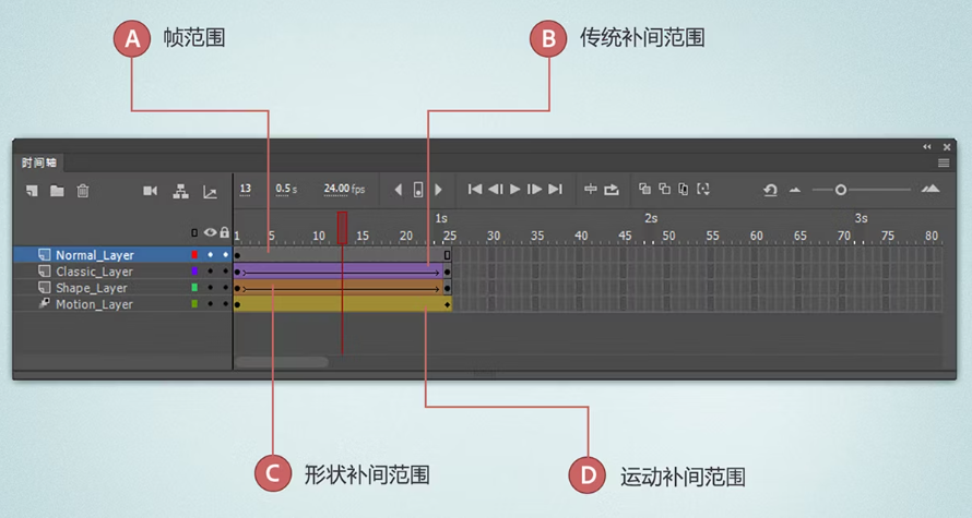 在补间帧范围内,请在每个帧范围内进行内容更改。您可以使用此类型的动画范围。