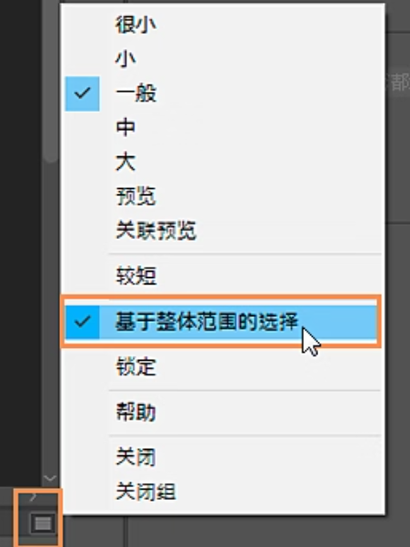 作为基于范围的选择的前提条件,您可以通过单击右上角的汉堡图标,然后选择“基于范围的选择”菜单项,来在 Animate 时间轴中指定基于范围的选择。