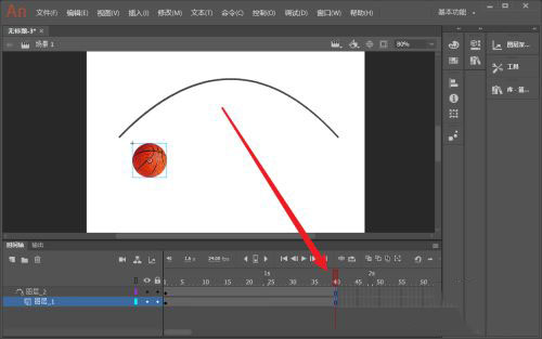 8、把篮球层的第一个关键帧上的篮球元件移动到曲线头部。同样把第40帧处的关键帧上的篮球元件移动到曲线末尾。