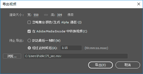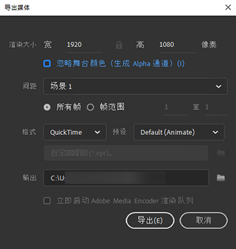 ③在 Adobe Media Encoder 中转换视频:如果您希望使用 AME 将导出的 MOV 文件转换为一种不同的格式,请选择此选项。如果选中,则在 Animate 完成视频导出后,AME 将启动。