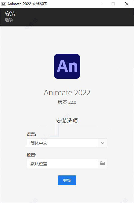 2、双击“Set-up.exe”,选择简体中文语言,自定义安装目录安装adobe animate2022;