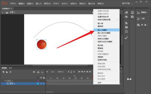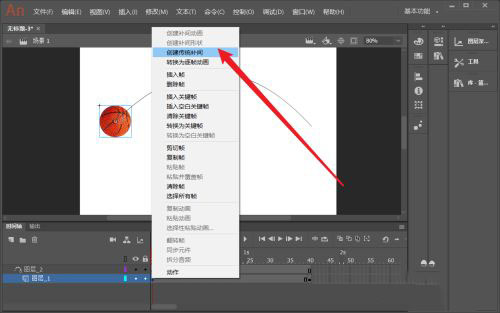 9、选择篮球第1个关键帧,然后点右键选择创建传统补间动画。这样一个篮球沿曲线轨迹运动的动画就制作完成了。