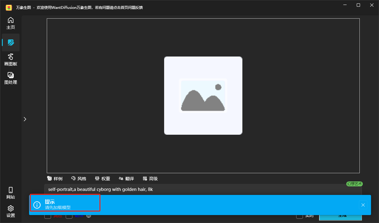 1、用户下载安装好万象生图软件后,运行需要先载入模型