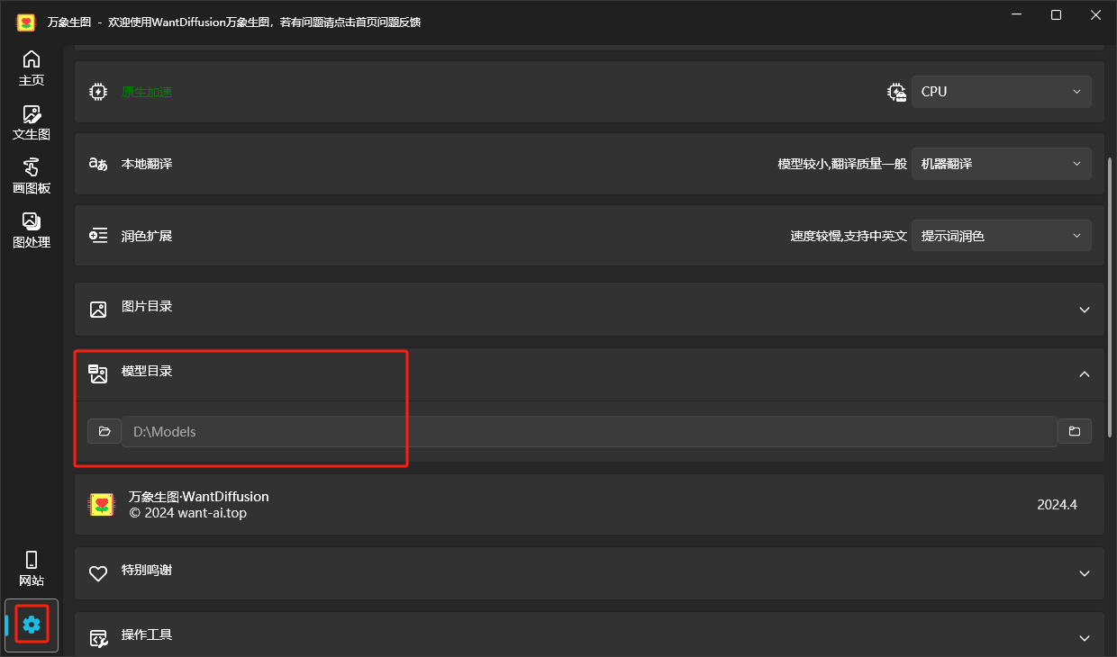 3、下载好模型之后,需要打开软件并配置模型目录,首先进入软件设置页,展开模型目录选项,并选择模型下载目录