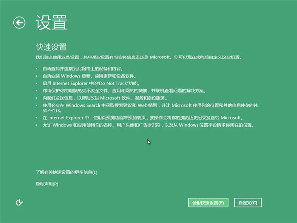 9、重启后开始设置新系统,这是设置的主要内容,涵盖网络、更新、隐私等,可以通过点击“使用快速设置”,也可以使用“自定义”设置