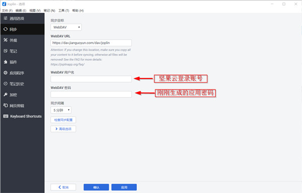 8、打开Joplin,点击菜单栏的工具->选项->同步,然后在弹出的界面里面点击同步,在弹出来的界面里面按照下图提示填写即可