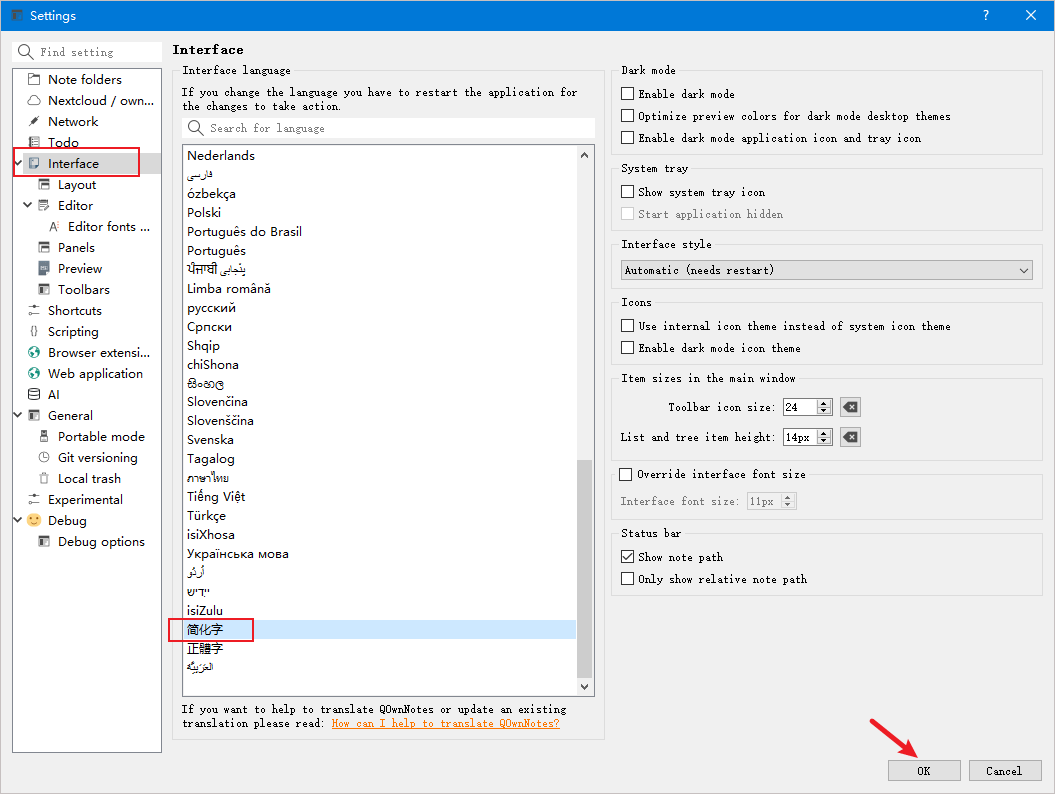 QOwnNotes中文设置方法
