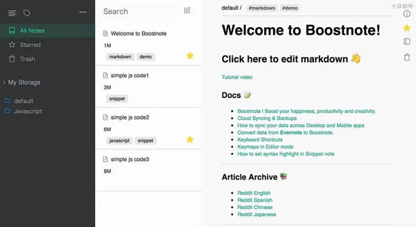 1、分组存储笔记很有趣Boostnote 设立了名为「Storage」的笔记分组功能,未来版本还会加入 Google Drive、Dropbox 的云目录分组功能。