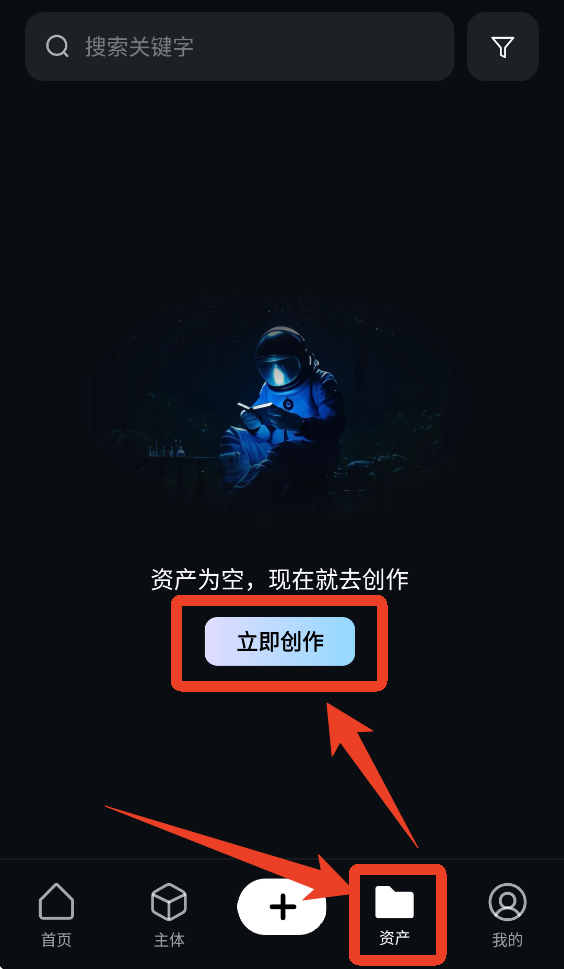 1、点击下方的【资产】,再点击中间的【立即创作】,就能开始创作你的第一个视频了。