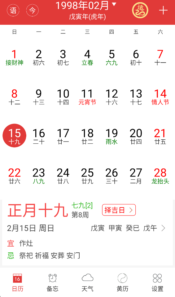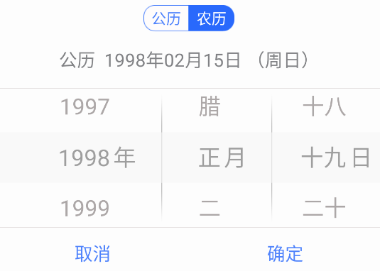 这里我们点击公历,把下面的日期滑动到你的公历生日,例如1998年2月15日。上方的农历就会显示对应日期的农历日期,1998年正月十九。