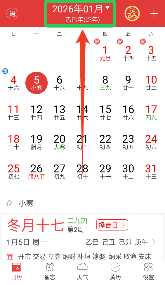 1、点击【日历】页面上方的日期,可以更换公历农历。