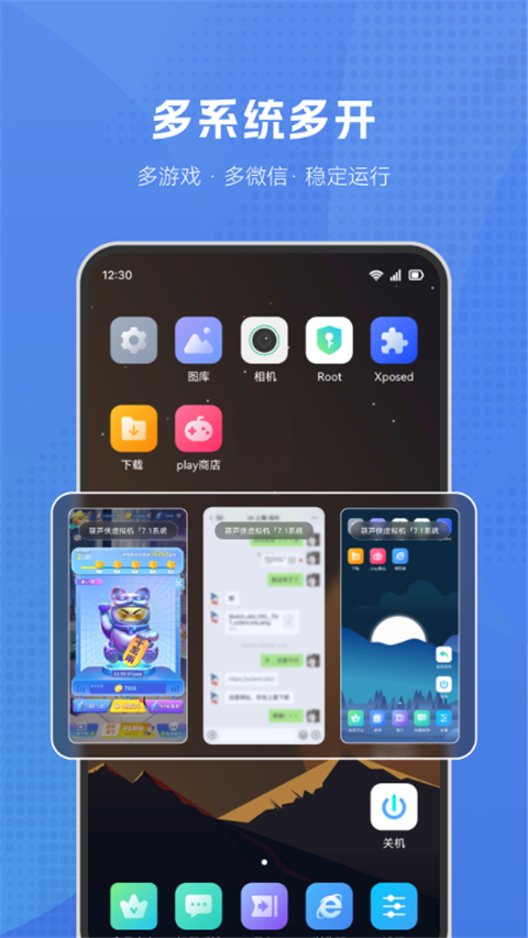 【悬浮运行】悬浮小屏默认显示,双指操作放大缩小。支持任意应用小屏操控。虚拟机与真机切换自如,一边娱乐一边游戏两不误。