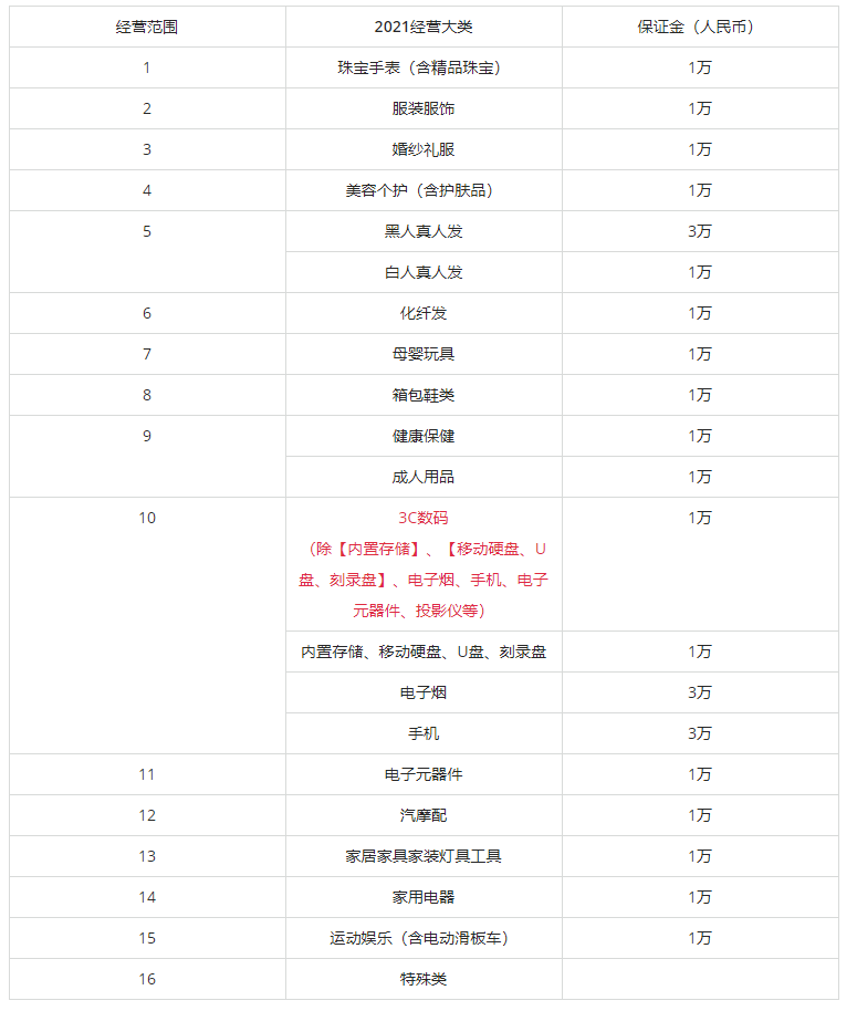 3.缴纳保证金:下图为各类目保证金一览(以实际缴纳为准)。