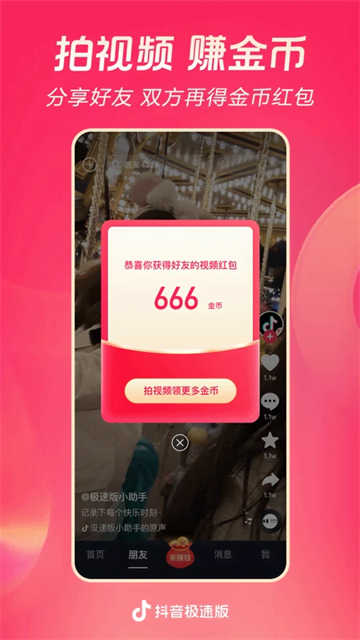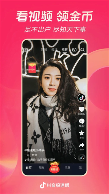 抖音极速版2026最新版是一个由官方推出的福利版本,用户可以同步账号刷视频,还能边看视频边赚钱。通过邀请好友、签到和观看视频等方式都能获得金币奖励,金币可以兑换现金。软件运行流畅,安装包小,特别省流量,操作简单方便。
