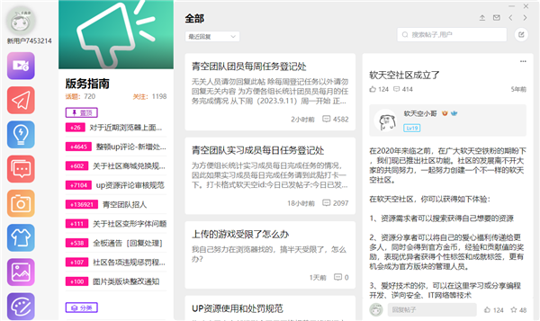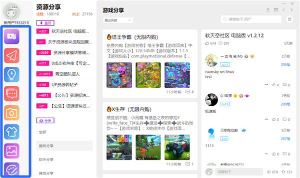 软天空电脑版是一款游戏玩家交流互动社区,是软天空手机端的社区模块,内置资源分享、游戏交流、交友互动等板块,助力玩家互助分享,结交更多好友。软天空社区PC客户端汇聚着众多游戏玩家,你可以在此推荐好玩的游戏、好用的软件,与其他用户交流游戏玩法、软件使用经验,也可以发帖寻找游戏、软件的资源,等待有缘人回复。软件还新增了表情包功能,用户可以将自己喜欢的图片上传作为表情包,同时支持在回复中添加图片、帖子、艾特其他用户。