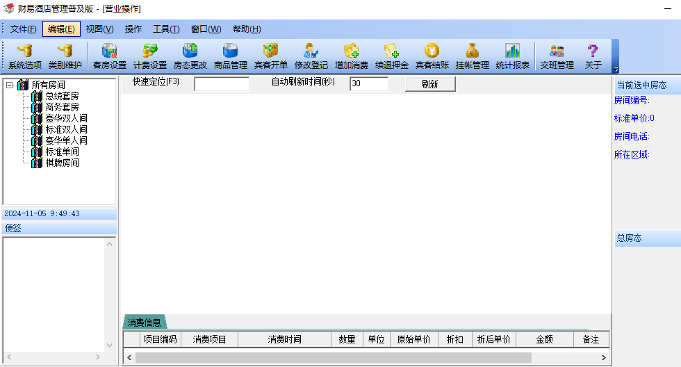 财易酒店管理软件普及版是一款专业的酒店管理软件,适用于广大酒店,丰富的功能包括宾客开单、续退押金、挂账管理等,帮助你轻松管理酒店事物。大量报表,如消费日报表,周报表,月报表,让你对酒店的经营状况一目了然。财易酒店管理软件普及版还拥有强大的自定义导出功能,用户还能根据自己的喜好自定义设计可供,开单,预定等状态颜色!欢迎有需要的朋友下载使用!