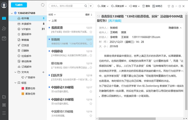 139邮箱电脑客户端是由中国移动通信开发的一款电脑客户端邮箱,很多小伙伴在登录邮箱时总需要打开邮箱网页既浪费时间操作也十分麻烦,今天给您带来的这款139客户端能够轻松帮您解决这样的麻烦,点击客户端即可轻松登录!139邮箱电脑客户端软件拥有简洁实用的外观,不但能够支持多账号管理、支持服务端同步,邮件、日历、通讯录等,同时支持POP3、IMAP、SMTP等收发协议等,用户使用手机号即可登陆,让用户可以更轻松的收发邮件,给你商务极速体验。喜欢的小伙伴不要错过哦!