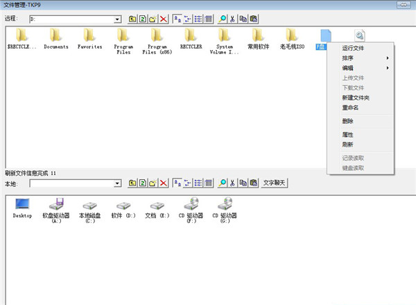 2、文件管理器上部分是远程电脑的资料,下部分是本机电脑的资料。选中本机(下部分)的 文件后向上拖拽,即可将你的文件上传到对方电脑,选中远程电脑(上部分)的文件,向本机(下部分)的目录拖拽,可以将远程电脑的文件下载到本机电脑中。软件还支持远程复制、粘贴、删除、剪切、搜索文件。选中文件后,使用鼠标右键也有相应的操作菜单,如下图:
