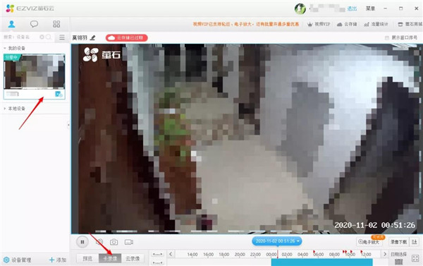 3、远程回放,在视频播放窗格,单击左下角的“历史录像”,选择卡录像即SD或硬盘录像,若设备也开通了云存储,也可切换。单击右下角的“日期选择”,即可回放对应日期下的设备录像