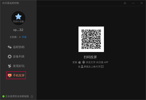 在手机打开向日葵控制端APP,扫描向日葵客户端的二维码,将手机画面投屏到电脑显示。