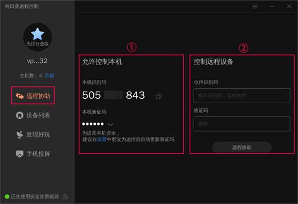 向日葵识别码,用于控制端对本机进行远程控制时的数字码凭证,是系统自动分配的九位随机码。作用如下: