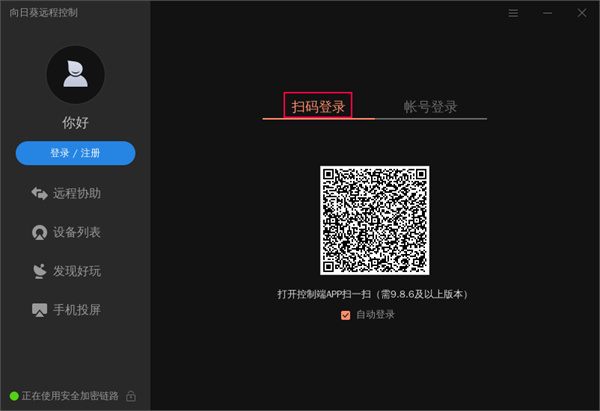 扫码登录:通过控制端APP扫码的方式进行登录;
