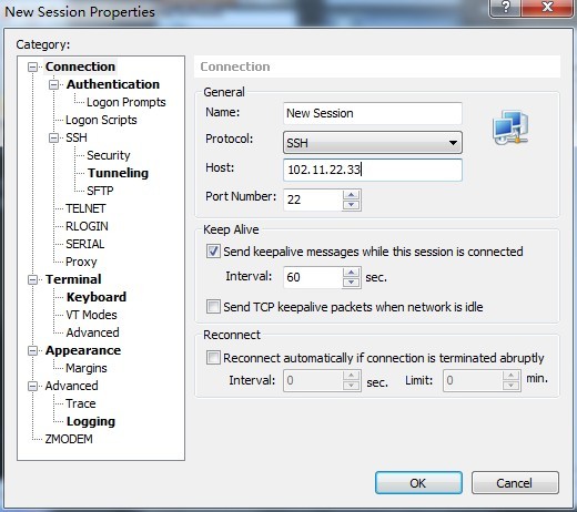 2、点击图一左上角的“New”按钮新建一个连接,弹出参数设置界面。输入连接名称和主机地址即可,端口一般都是默认的22。