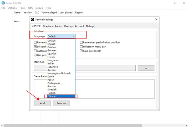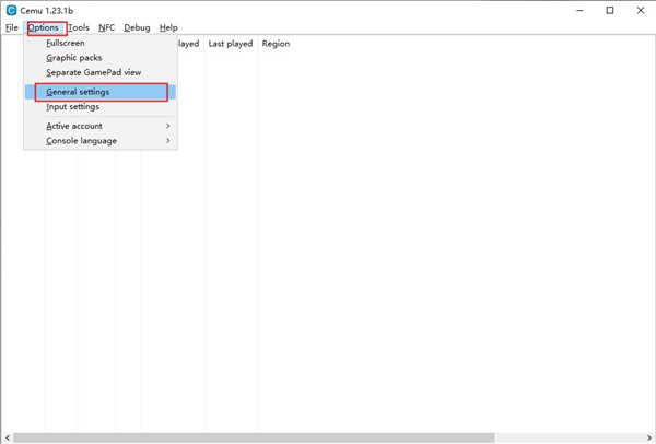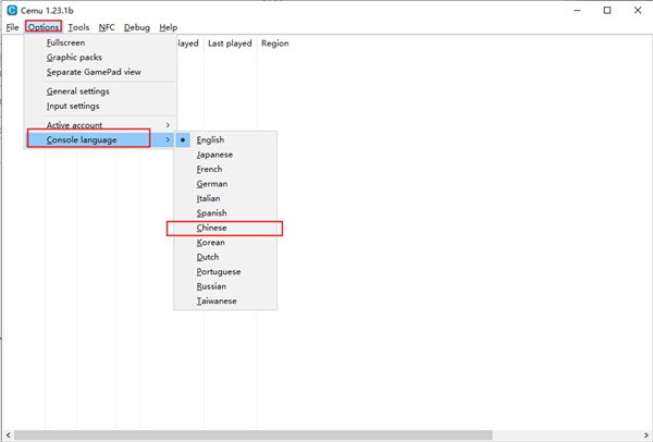 1、双击运行"Cemu.exe"程序进入主界面,先依次点击Options-Console Language-Chinese设置主机语言;