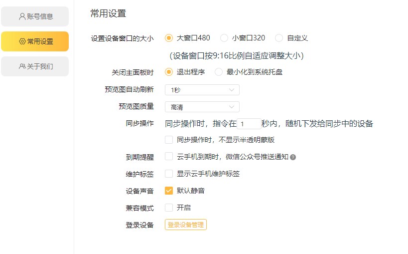 常用设置:可以设置一些通用的设置,比如设备窗口大小、到期提醒、设备维护标签等。