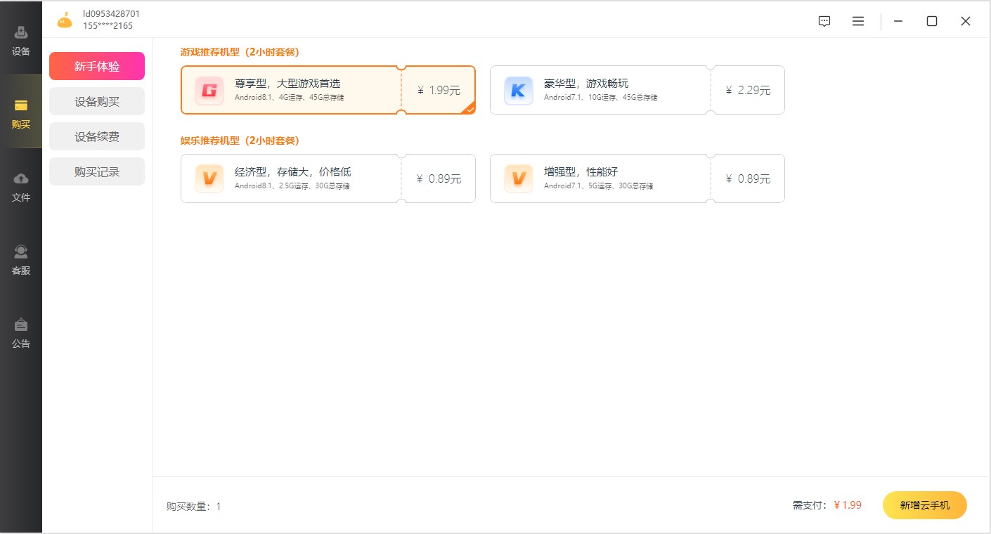新手体验:购买新手体验套餐。