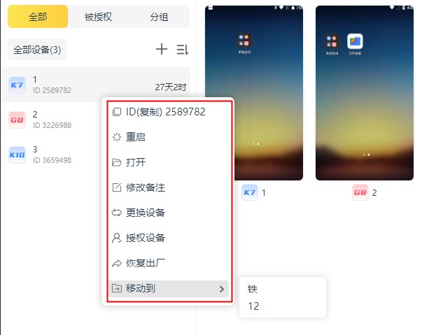 11、鼠标右键会有弹窗,可对设备重启、更换授权等,“移动到”是移动到对应的分组,批量分组在批量管理里面。