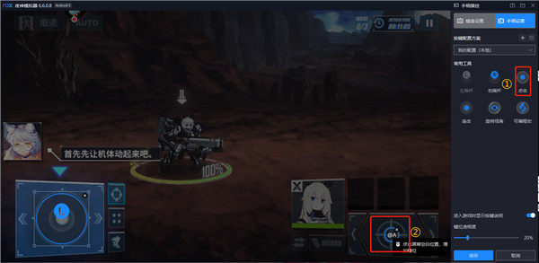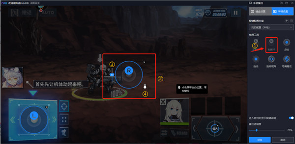 使用范例:将右边左摇杆功能拖动到控制角色移动的方向键上,然后将左摇杆缩放到与游戏方向键重叠大小。