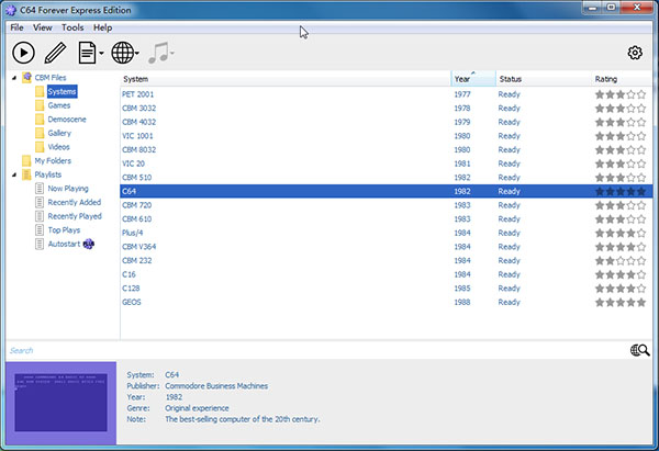 C64 Foreve 10是一款功能齐全且非常好用的C64仿真模拟软件,为用户提供了一个简约直观又精致的播放器界面,拥有内含数千个丰富的C64游戏标题和配置的强大数据库支持,可运行超多能下载的C64和其他8位游戏一键式播放、演示,并且软件还提供了独特创新的RP9格式,实现了超高的标题创建编辑以及跨平台式播放,完美的将高级配置选项与专业内容创作功能相结合。