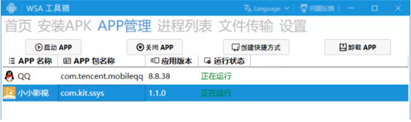 4、也能在WSA工具箱 -> APP管理 - 管理所有安装的安卓应用的 开启、关闭、卸载 & 创建快捷方式等。
