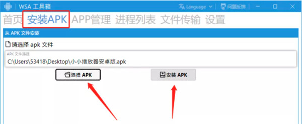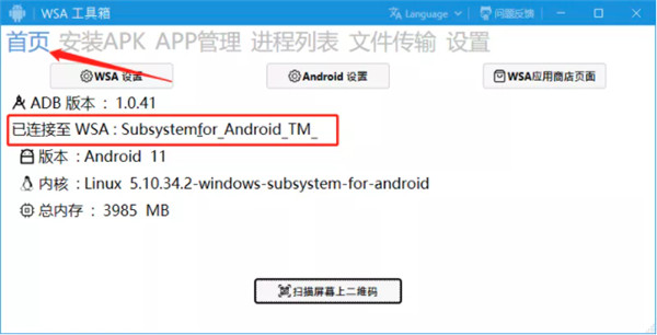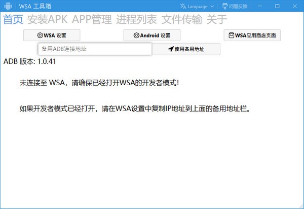 2、如果软件提示:已连接至WSA,则你就能用WSA工具箱任性安装安卓.apk文件了!如若不能,请检查开发人员模式是否打 开,或者填入备用IP地址。