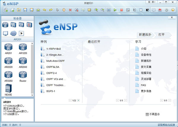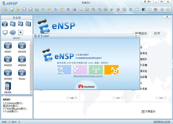 eNSP提供便捷的图形化操作界面,让复杂的组网操作变得更简单,可以直观感受设备形态,并且支持一键获取帮助和在华为网站查询设备资料。