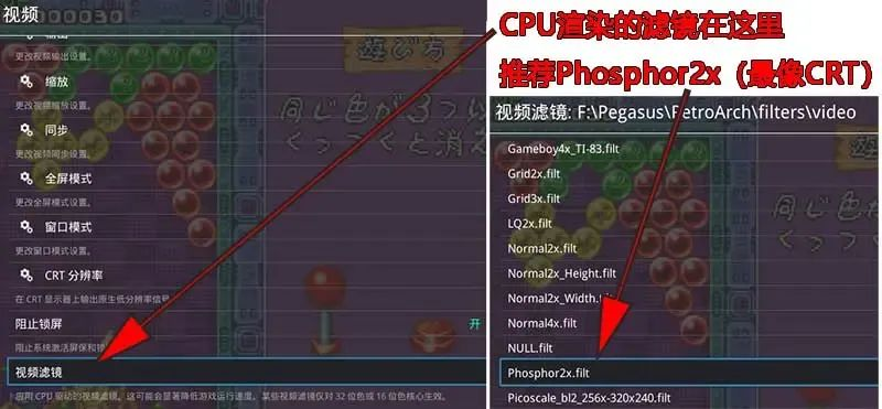 滤镜和着色器其实是一种东西。它的功能是提供接近原始主机的显示方式,比如隔行扫描,CRT效果等,最大程度地让玩家沉浸在怀旧游戏氛围中。