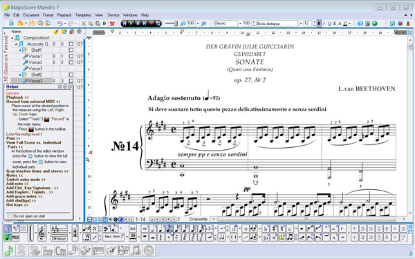 MagicScore Maestro得分中的每个元素都可以在作曲家所欲望的任何地方进行编辑和移动。只需点击并点击谱号,括号,条形线,表达式或单个注释,将它们精确地放在页面上您需要的位置。这些强大的视觉布局工具与同样强大的一组选项相匹配,如果需要,可以帮助作曲家微调音频播放,以控制诸如个人笔记的攻击和释放等细节。然后可以使用逼真的sf2声音字体直接播放或导出完整的合奏或单独的乐器部分,直接导出到高品质的MP3或WAV格式的音频文件中。