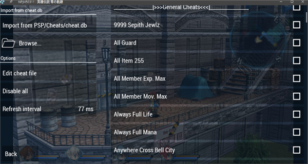 点左上角的import from PSPICheatsicheatdb, ppsspp就会自动识别游戏,然后从cheat db导入对应的金手指,右侧就会出现金手指选项,用户按照需求开启即可