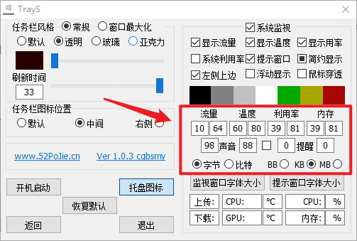 2、先在左侧选择 任务栏风格 以及 任务栏图标位置 ,然后勾选 开机启动 ,该工具占用资源少可放心启用。右侧的 系统监视 可帮助我们简洁明了的获知 硬件状态,可 按需勾选 想要功能,另外也支持对 字体大小 进行调整。