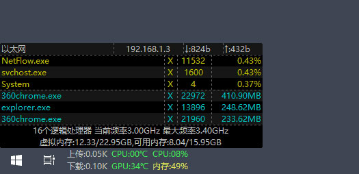 4、再看下电脑状态显示效果,这里分别展示的是,上传/下载流量、CPU/GPU温度以及CPU/内存使用率: