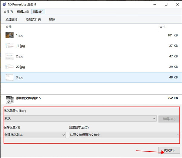 将立即优化文件;并基于您当前的“保存配置文件”, 替换原文件或在同一个文件夹中创建一个副本。
