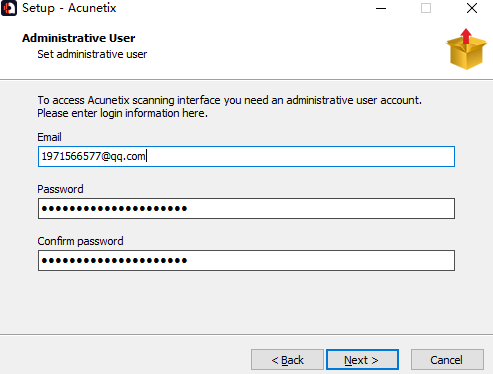 4、设置管理用户,输入电子邮箱和密码(可随意输入),不过需要注意的是在输入密码的时候必须至少包含8个字符,并必须包含以下1个号码中的至少3个,1个小写字母,1个大写字母和1个特殊字符eg@@$%%等