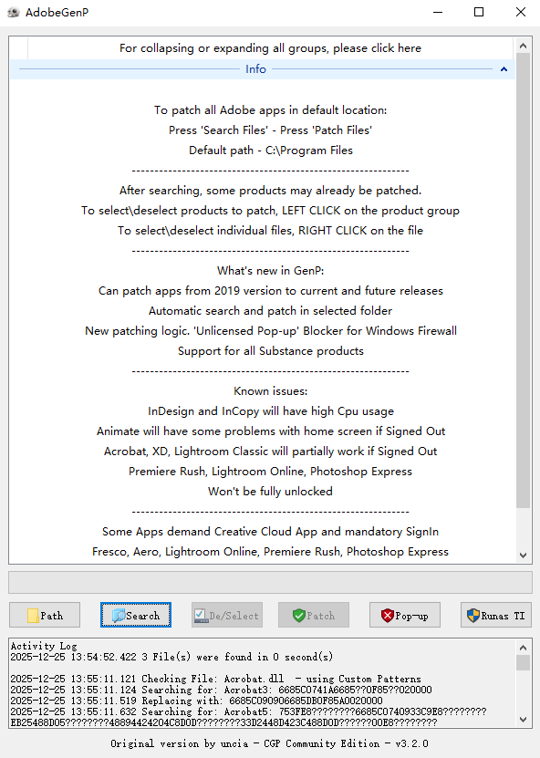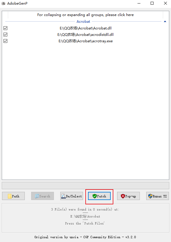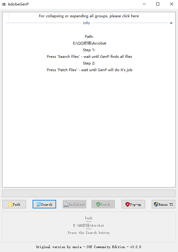 3、打开Crack文件夹中的exe修改程序,点击Path选择程序的目录文件夹后,再一次点击Search选项;